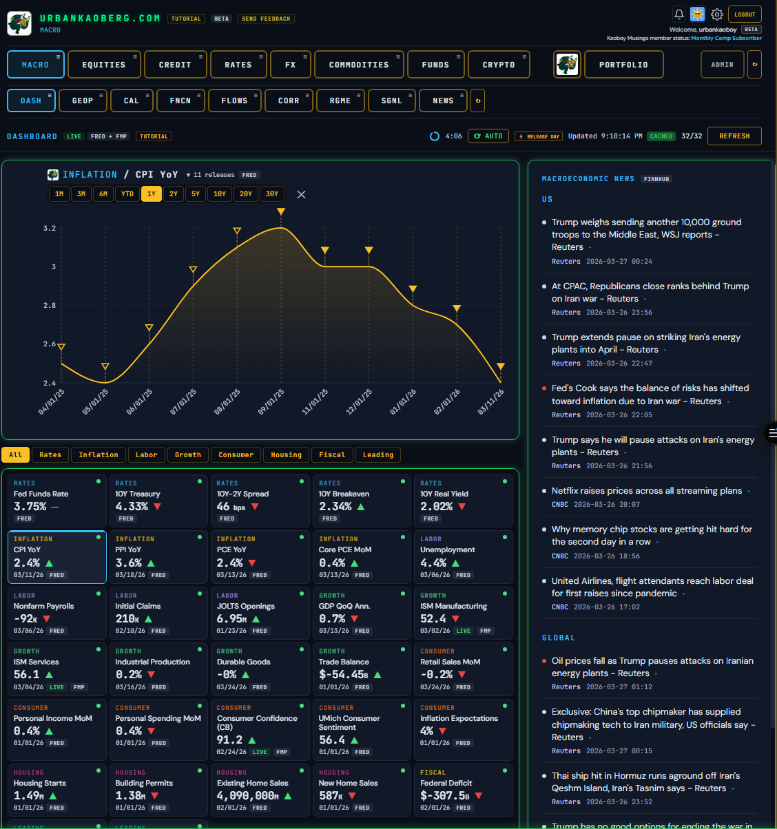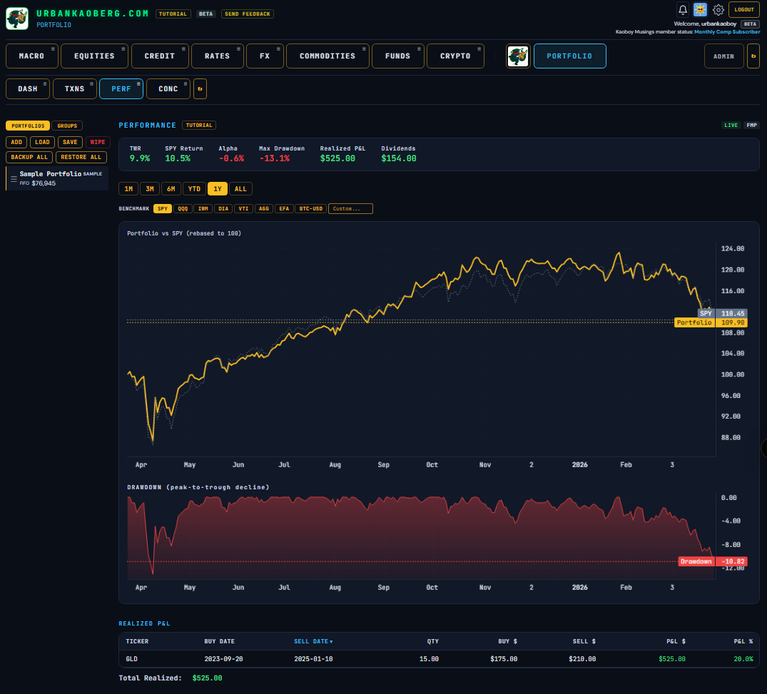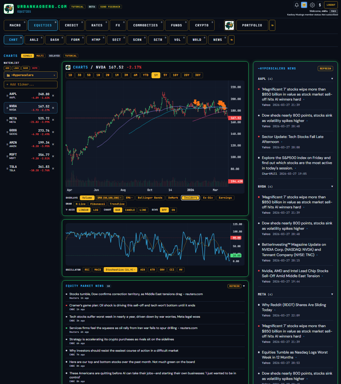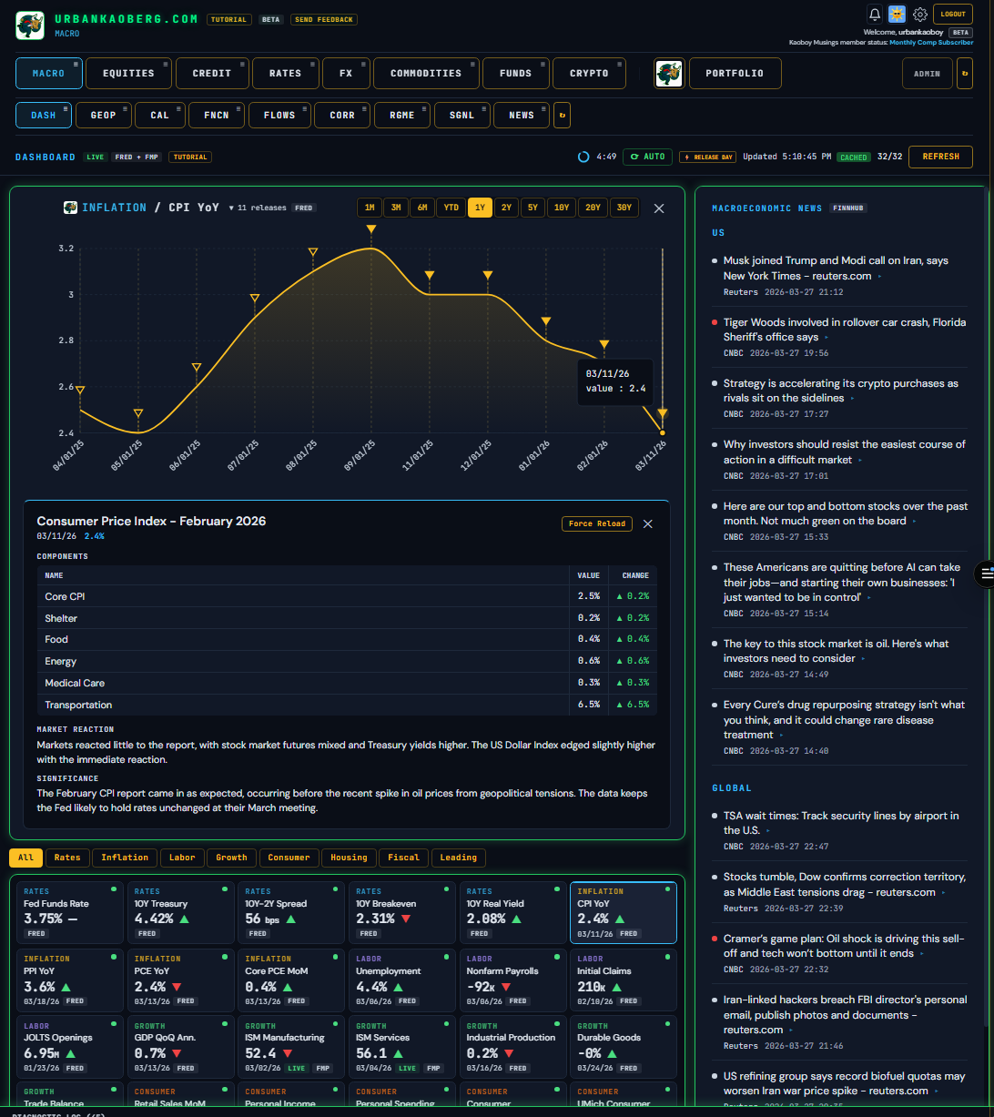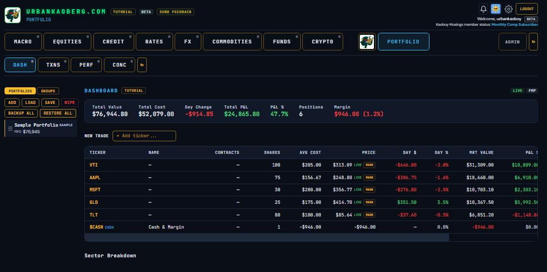 Over the past three weeks, I built a Macro/Micro financial research terminal called UrbanKaoberg.com from scratch — a potential alternative for RIAs (Registered Investment Advisors) and FOs (Family Offices) who can’t justify $25,000 a year for a Bloomberg subscription but need more analytical horsepower than what many other retail products currently offer. It pulls near real-time and historical data from half a dozen providers, renders interactive charts across Equities, Rates, Credit, Commodities, FX, Crypto, and more. It has a Portfolio Tracker with P&L attribution, a customizable Watchlist system, a full suite of deep analytical and valuation tools for Equities, a detailed Macro dashboard with the latest important data releases, a launchpad into Special Situations dashboards, a Live Chat feature, full Tutorials, etc. The feature set goes on…