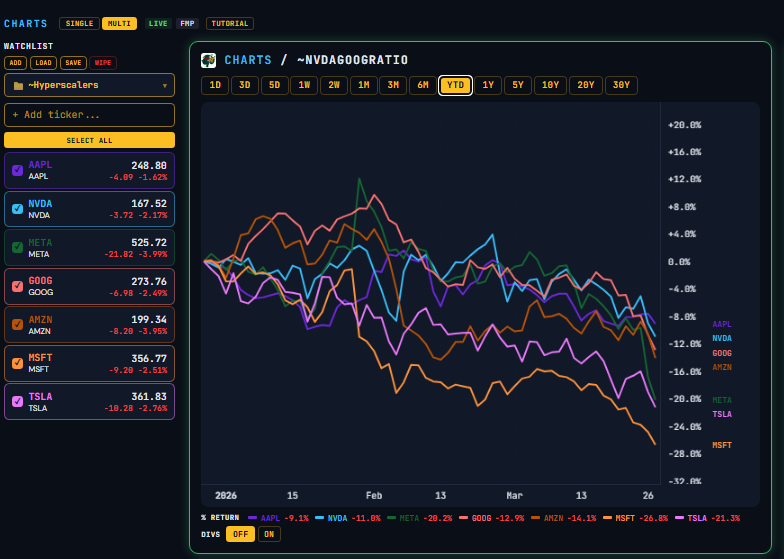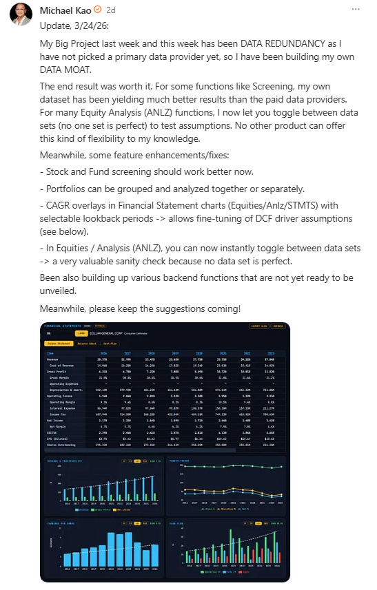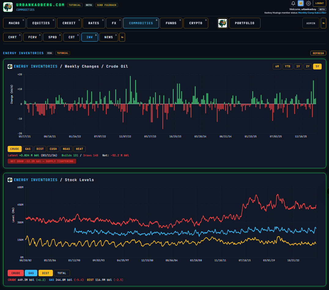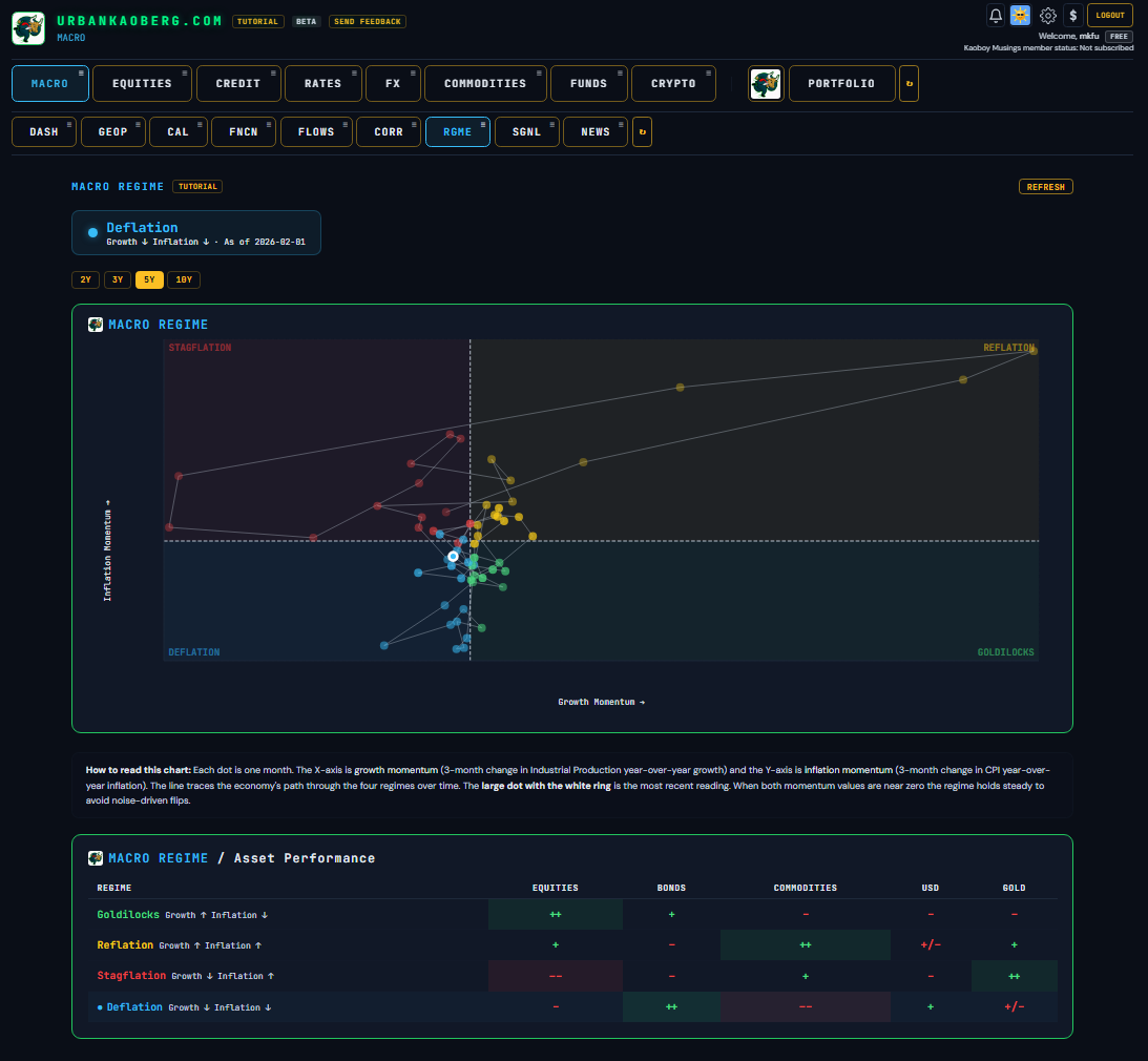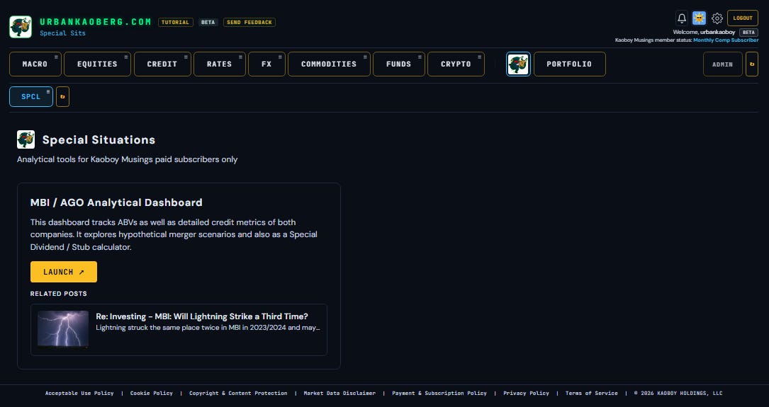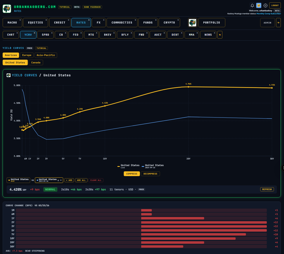 Over the past three weeks, I built a Macro/Micro financial research terminal called UrbanKaoberg.com from scratch — a potential alternative for RIAs (Registered Investment Advisors) and FOs (Family Offices) who can’t justify $25,000 a year for a Bloomberg subscription but need more analytical horsepower than what many other retail products currently offer. It pulls near real-time and historical data from half a dozen providers, renders interactive charts across Equities, Rates, Credit, Commodities, FX, Crypto, and more. It has a Portfolio Tracker with P&L attribution, a customizable Watchlist system, a full suite of deep analytical and valuation tools for Equities, a detailed Macro dashboard with the latest important data releases, a launchpad into Special Situations dashboards, a Live Chat feature, full Tutorials, etc. The feature set goes on…