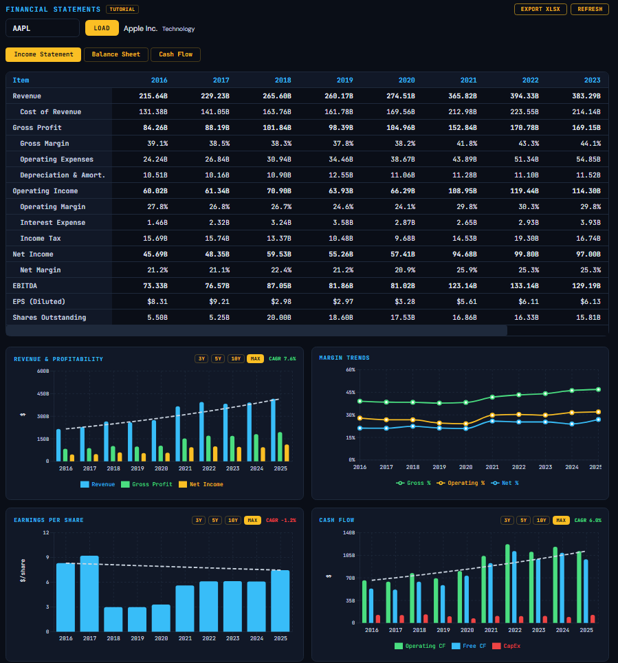 Building this was not easy and required parsing SEC filings, handling multi-class share structures, applying different overlays for different sectors (since every industry files its financials differently), and backfilling financial data for 10,000+ tickers.
