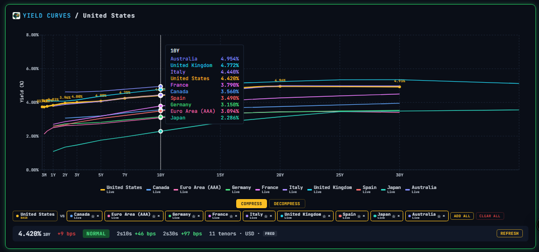 You can also quickly compare Global Yield Curves at a glance: