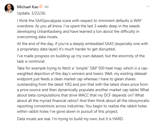 I believe that the SaaSpocalypse scenario being priced into financial markets is overdone. While it’s true that AI coding lowers one barrier to entry, it does not lower many other barriers presented by Data Moats, Workflow Inertia (Hard Habits To Break), and User Experience. Human judgment is still the most important factor in my opinion.