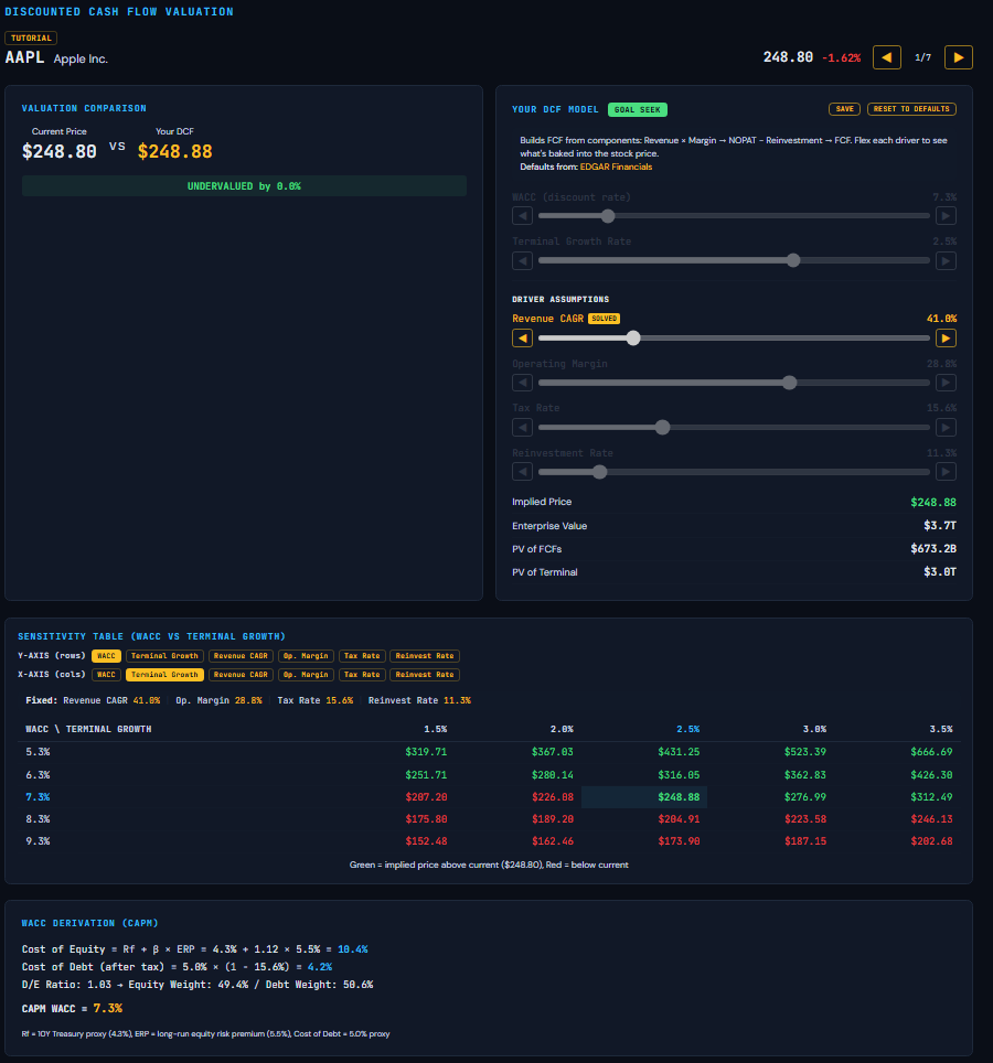 The DCF Module allows you to fundamentally value companies and even Goal Seek certain drivers like Revenue CAGR to what the current market value implies: