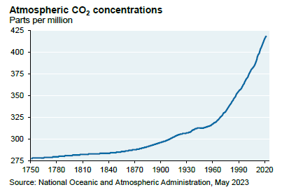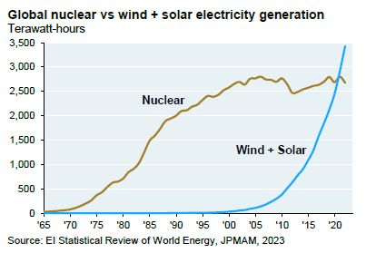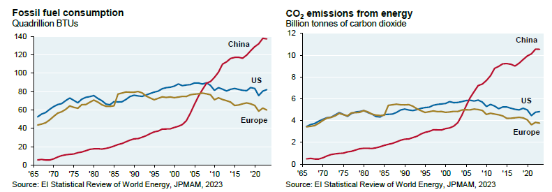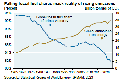 As the charts below from JPM show, despite the trillions invested and despite the consistent reduction of fossil fuel share, atmospheric CO2 continues its inexorable march higher without ending the world. As my climate piece suggests, the factors affecting Climate Change over Phanerozoic time-scales (measured across eons) are incredibly complex and multivariate.