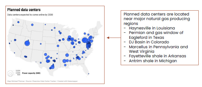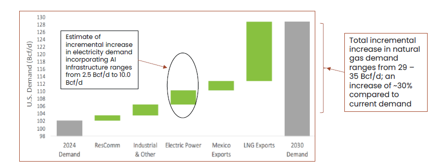 Dry Gas Producers: Investing in companies with high-quality inventory in the Haynesville in particular. These producers benefit directly from the secular demand pull of AI data centers and the 30% projected increase in total gas demand by 2030. The Haynesville is really the swing producer given its ability to move molecules to market versus many of the other more geographically (and regulatorily) constrained basins.