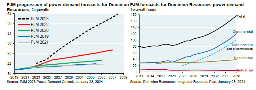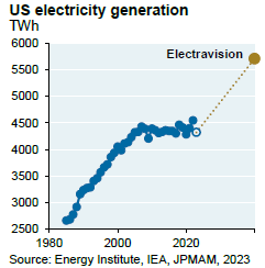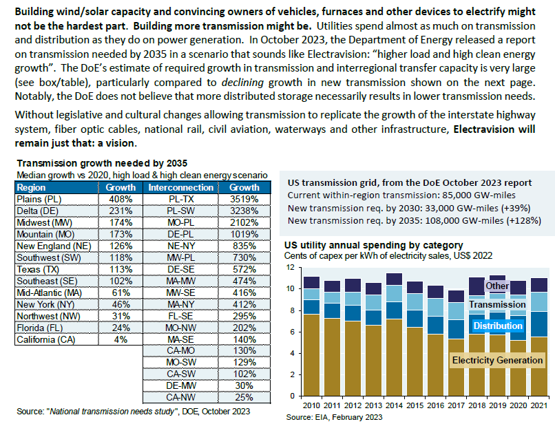 “An important caveat: our Electravision scenario assumes that total US energy needs will not change much over the next two decades. Unchanged US energy demand is consistent with the last couple of decades; the energy needs of a growing US population have been offset by improving energy efficiency. However, the rise of AI might change that. One illustrative example: the PJM (mid-Atlantic) region has made sharp increases to projections of future power demand for Dominion Resources, a utility serving 6 million customers in 15 states. These increases are entirely due to an increase in data centers which serve advanced computing/AI needs. Constellation Energy estimates that the AI revolution could require more power in the US than the future electric vehicle fleet.”