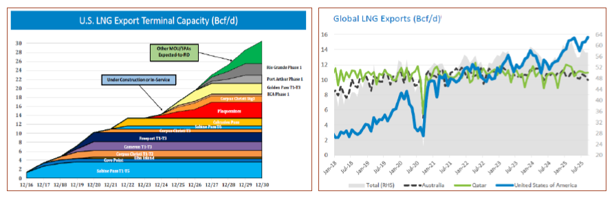 Current US LNG Export capacity is estimated between 16–18 Bcf/day and is expected to almost double to over 30 Bcf/day by the early 2030’s. This includes expansion of current facilities as well as new facilities under development.