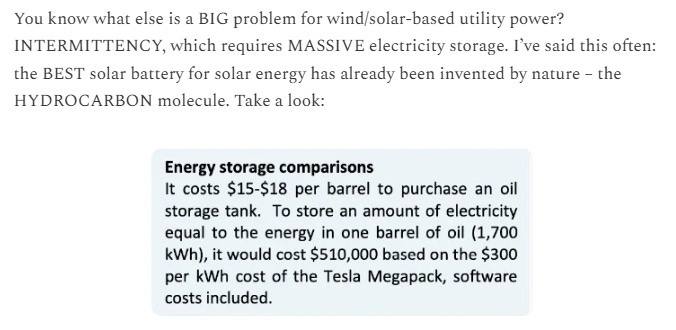 I pointed out the problem with Intermittent Energy Sources like Wind and Solar and still believe to this day that the most efficient battery for solar energy has already been invented by nature — it’s called the Hydrocarbon molecule:
