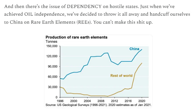 We spent the last 5 years arguably solving for the wrong variable with ESG mandates pushing us into a new Geopolitical Dependency with China on Rare Earths, effectively trading Geopolitical Dependency on OPEC in Oil for a more fragile Geopolitical Dependency on China for Rare Earths.
