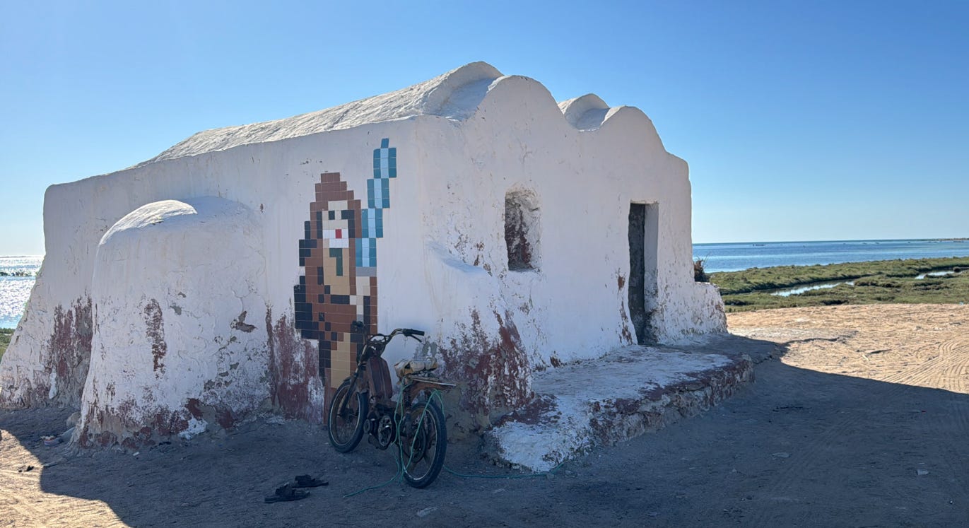 Tozeur was built around one of North Africa’s largest natural oases, fed by hundreds of artesian springs and shaded by over 200,000 date palms. Today, Tozeur is surreal—palm forest on one side, Sahara on the other. We stayed a cool spot right overlooking the great salt lake bed of Chott el Djerid.