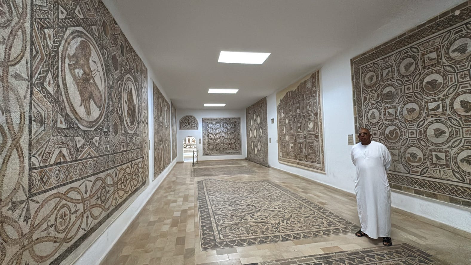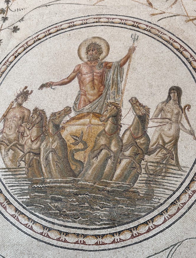 The walls are covered floor-to-ceiling with images of gladiators, gods, hunting scenes, myth, sex, and agriculture. It’s what you get when a whole province—Africa Proconsularis—gets rich from olive oil, grain, and imperial favor, then wants to show it off in floor tiles!