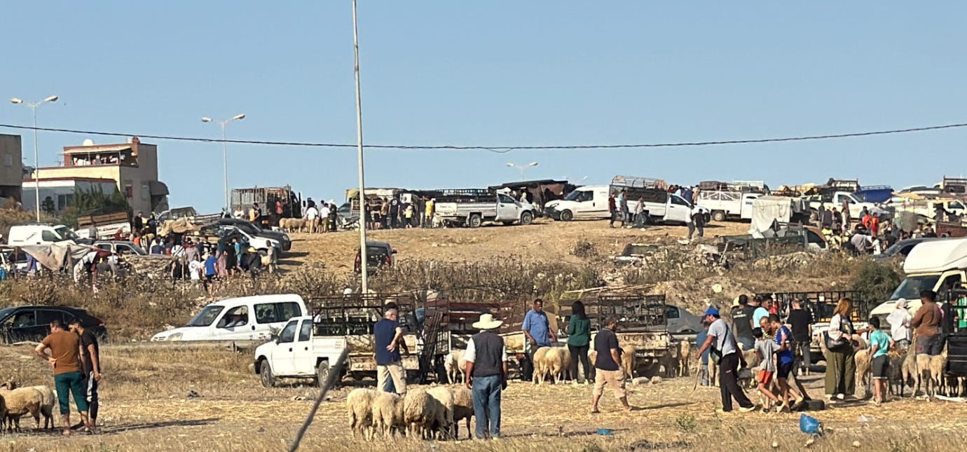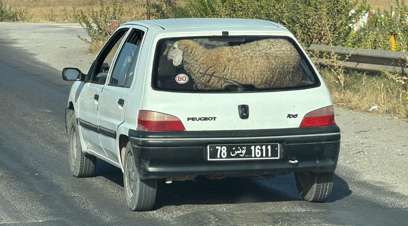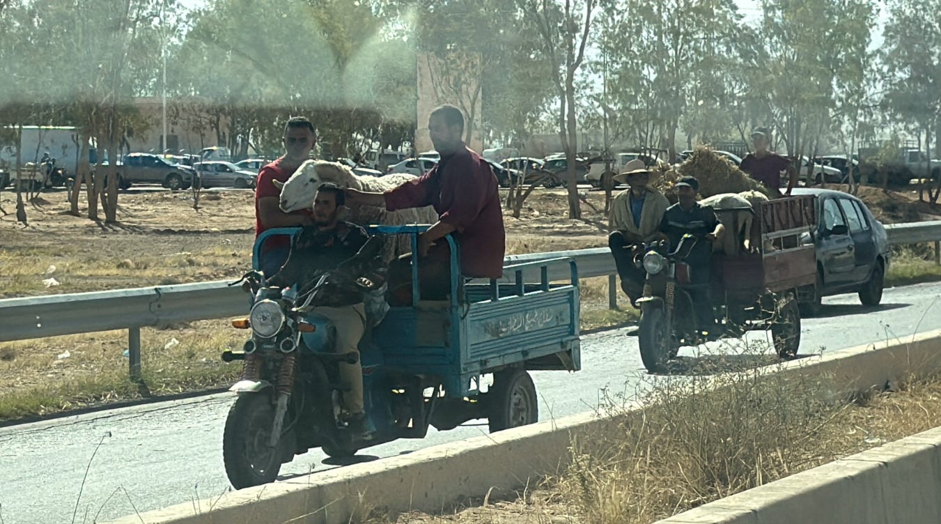 One of the most unexpected sights we encountered on our roadtrip from Tozeur back to Tunis was “sheep market traffic” due to the impending Arabic Festival of Sacrifice, also known as Eid al-Adha. It is one of the two major Islamic holidays, commemorating the prophet Abraham’s willingness to sacrifice his son as a sign of his faith. Celebrations include special communal prayers, the ritual sacrifice of a sheep, and sharing the meat with the poor, friends, and family.