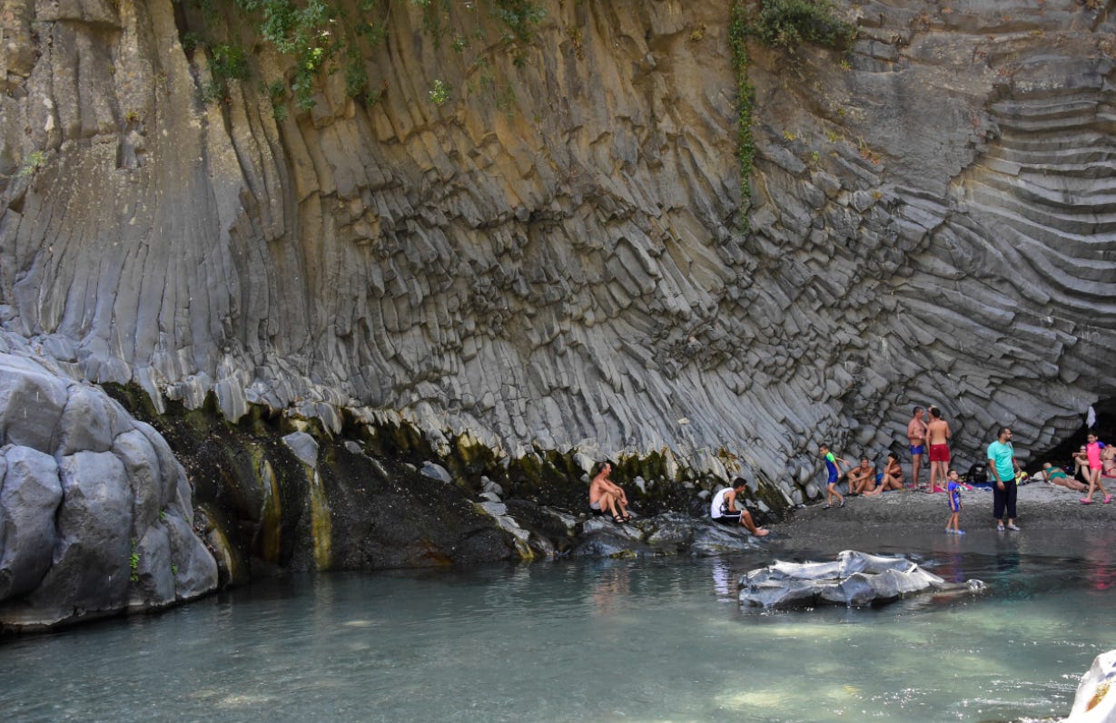 The Alcantara River Gorge also sits on the flanks of Mount Etna, home to the Cyclopes as well as Hephaestus/Vulcan, the smith god who forged thunderbolts for Zeus/Jupiter.