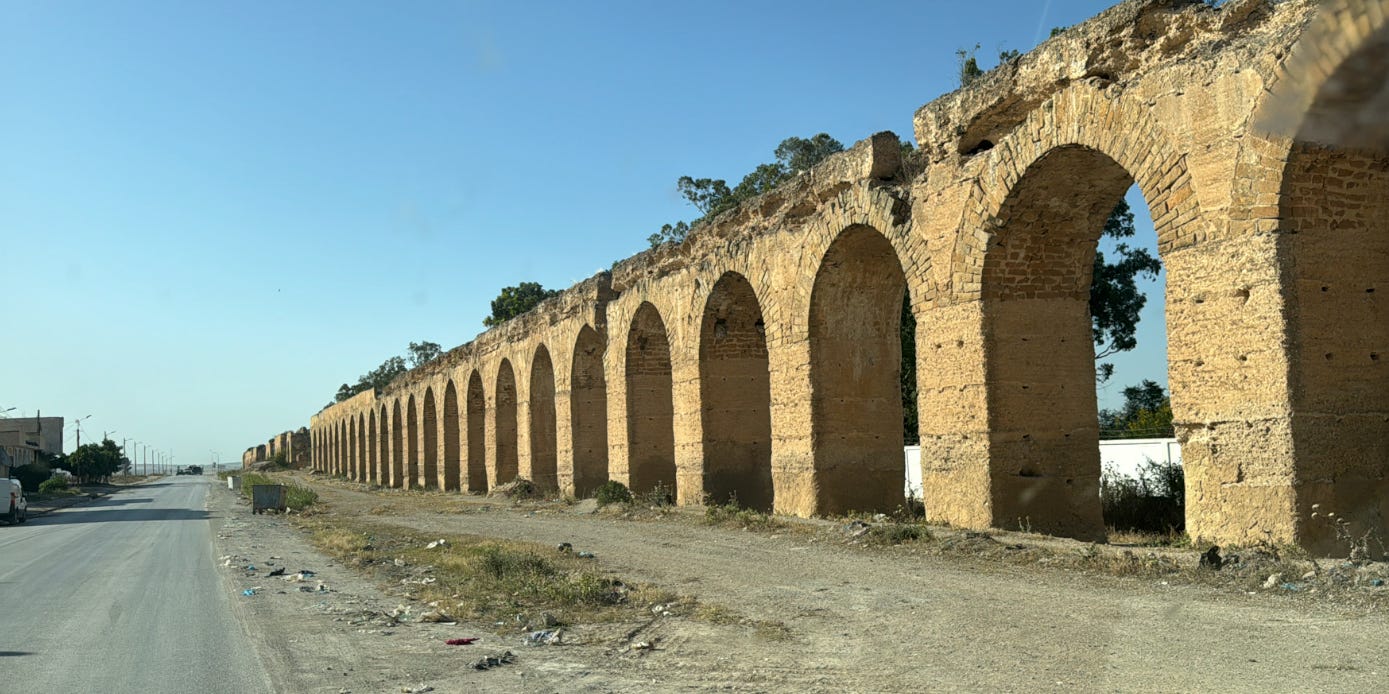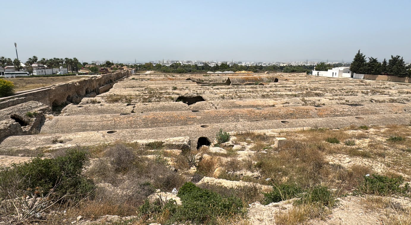 Ahmed also took us to this massive La Malga Roman Cistern and Reservoir Complex which served as the terminus of the Zaghouan Aqueduct. This system of 15 vaulted cisterns, each over 100 meters long, stored and circulated the water to avoid stagnation — an incredible testament to the level of advanced hydraulic engineering expertise that the Romans possessed.
