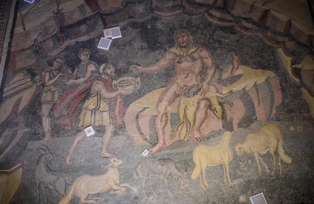Really cool mosaic of Odysseus’ (Ulysses’) men placating the Cyclopes Polyphemus (although why he has 3 eyes instead of 1 is beyond me):