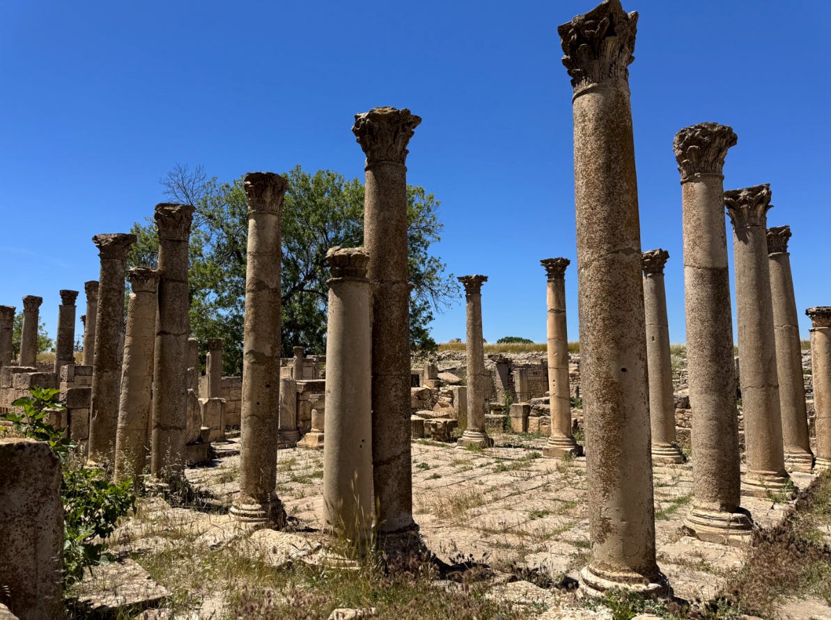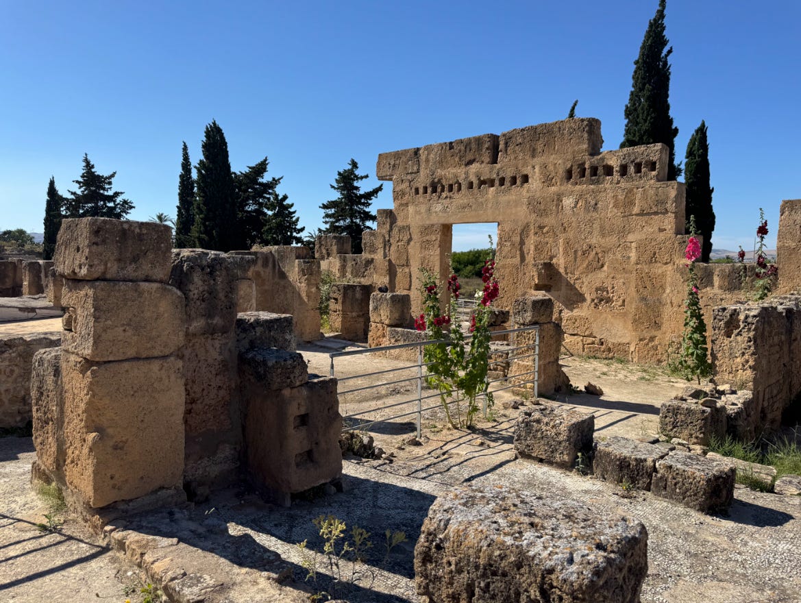 By the Second Punic War (218–201 BC), things got mythic. Hannibal crossed the Alps into Italy with war elephants, dealt the Romans their most catastrophic defeat at Cannae, but still couldn’t take Rome. What he did do to Rome was terrify it, which would have grave repercussions later. This war stretched from Spain to North Africa to Sicily, and every time you move between these places, the scale starts to make sense. Back in Tunisia, Carthage simmered while Hannibal campaigned abroad. And when he finally lost at Zama—just inland from where Utica now lies—the writing was on the wall. Rome spared Carthage that time. Utica, older and more Roman in temperament, eventually became the regional capital. Today, its ruins are scattered on a windswept hill—Roman mosaics, Punic shards, and not a tour group in sight (except maybe my group!).