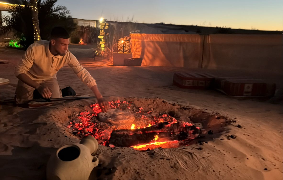 One of the staff making khobz tabouna, a traditional Berber bread that is baked directly in the heated sand: