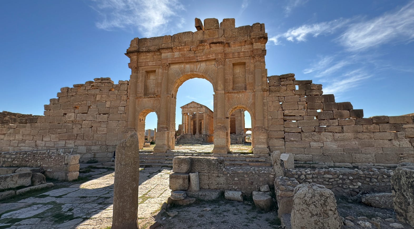 Sbeitla offers among Tunisia’s best‑preserved Roman civic architecture — the Capitolium Temples, Arches and Seats show a full civic layout. It illustrates the height of Roman provincial urbanization in Africa before the decline.