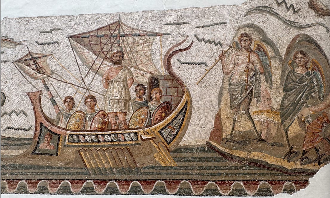 My favorite mosaic at the Bardo is below, which depicts Odysseus (Roman Ulysses) tied to the mast, wanting to hear the seductive song of the Sirens, while his sailors remain safely earplugged: