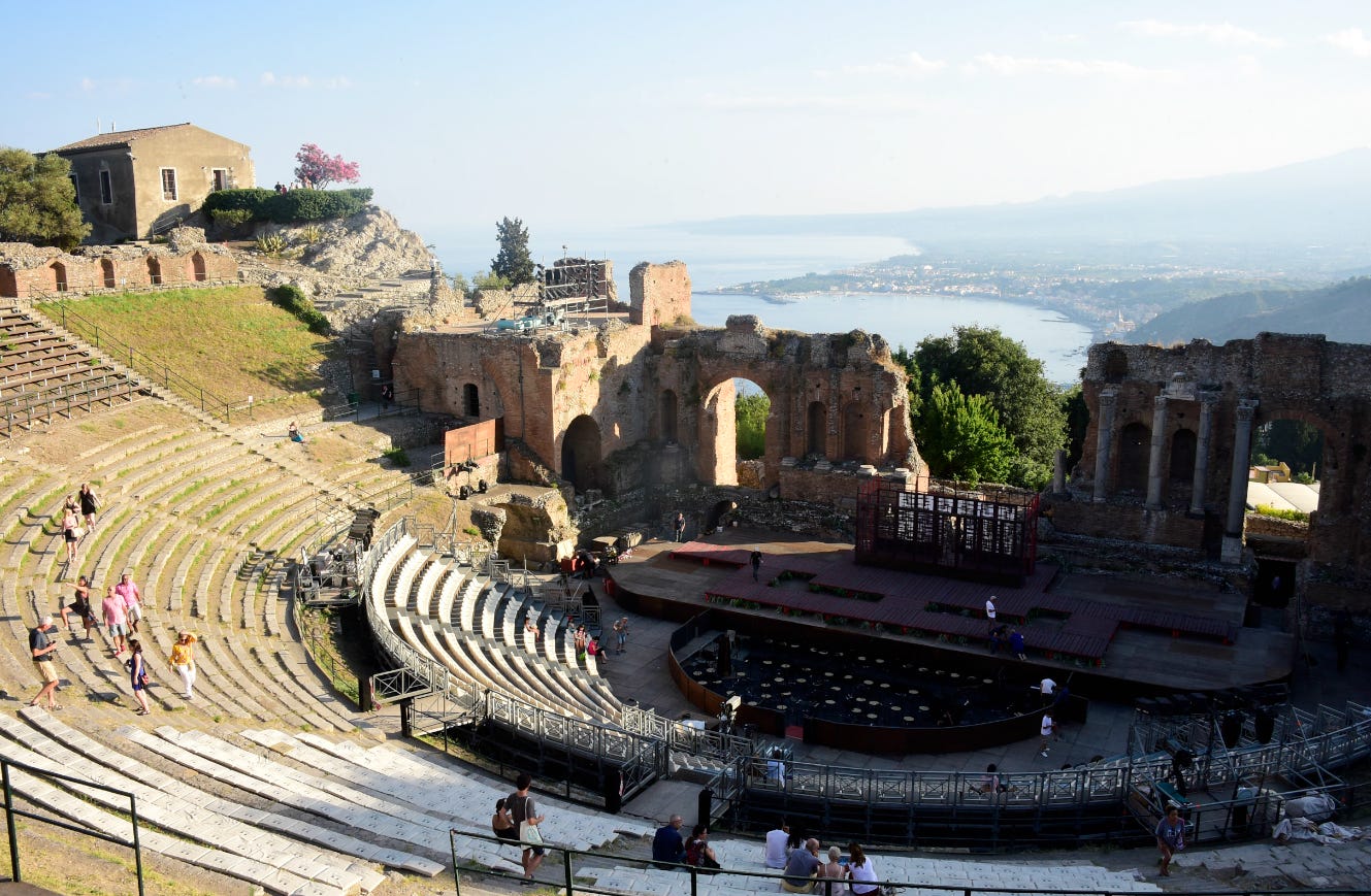 The Taormina Greek Theater, later renovated by the Romans, is one of the most spectacular ancient venues in the world—still used today for concerts and performances.