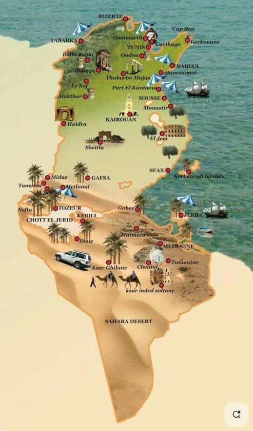 Here is a fun tourist map of modern Tunisia, which summarizes our whole-country itinerary nicely: