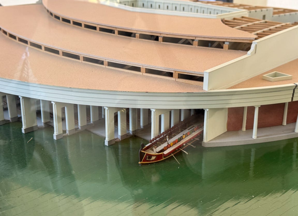 Below you can see the circular dock and shipyards that housed the Carthaginian navy, and the model imagines what it must have looked like:
