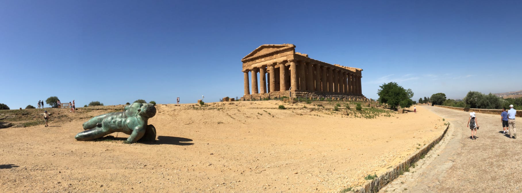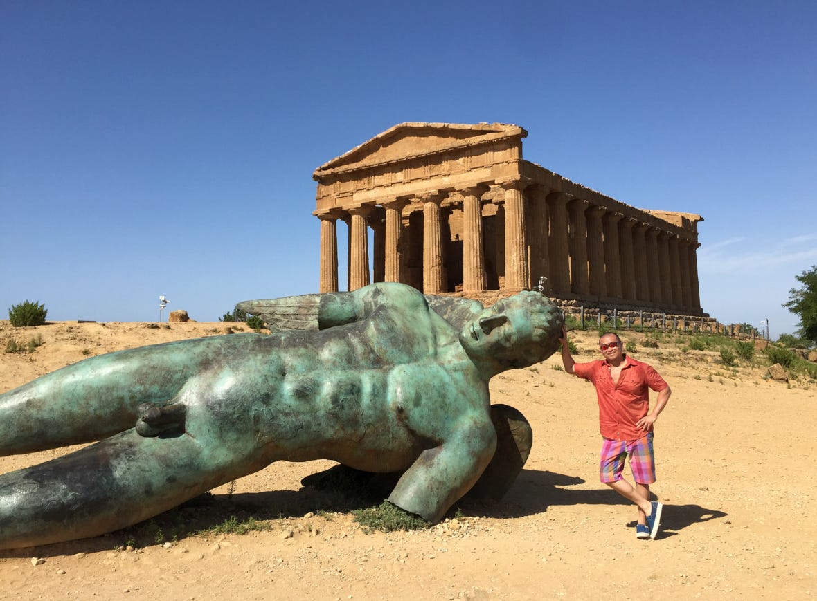 Below is the Temple of Concordia, built around 440 BC, also Doric in style. It is the largest and best-preserved Doric temple in Sicily and one of the best-preserved Greek temples in general. Although the giant Bronze of Fallen Icarus is modern, its scale and placement are perfect!