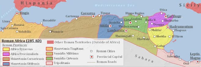 Roman North Africa coincides with much of the modern Maghreb countries of today, and given its geographical proximity to Spain and Sicily, this area played a key role in not just the Punic Wars but much of Roman history. Modern Tunisia was split into two Roman provinces: Africa Proconsularis and Africa Byzacena.