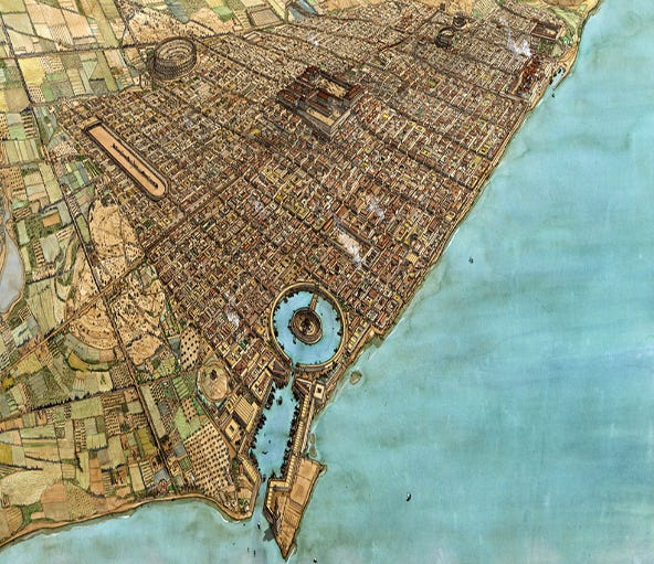 Ancient Carthage was famed for its circular Punic Ports that housed hundreds of hidden ships; the circular port then opened into a rectangular harbor as depicted this artist impression of Roman Carthage