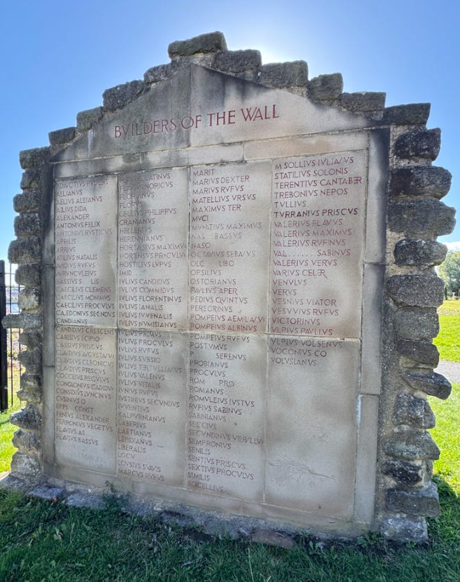 This is a monument to the builders of Hadrian’s Wall, which was constructed in just five years from 122-126 CE under the command of the governor, Aulus Platorius Nepos and executed by three legions: II Augusta, VI Victrix, and XX Valeria Victrix: