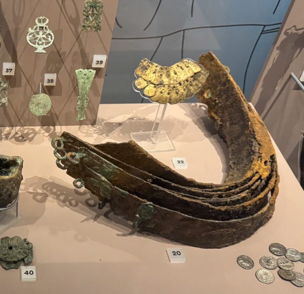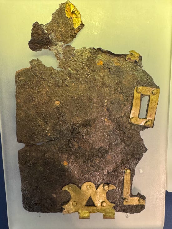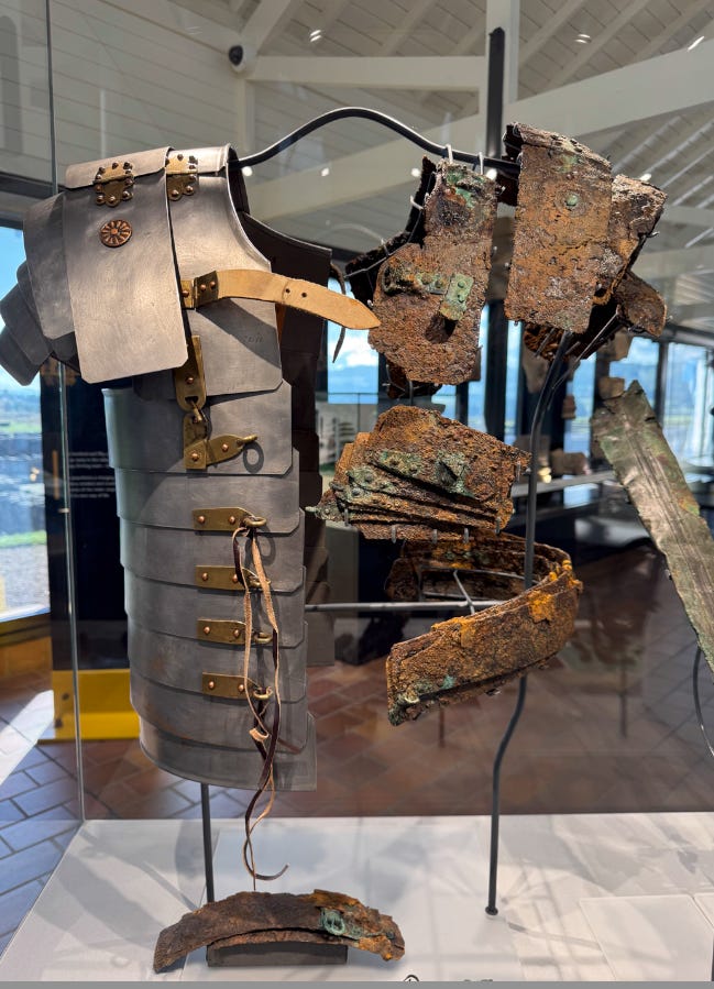I loved to see the actual remains of lorica segmentata body armor with bronze hinges and hooks still in position. This section was part of the Corbridge Hoard (mentioned further below):