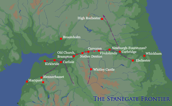 During this period, many forts were established along a frontier known as the Stanegate, which was an east-west military road running from Corbridge (Coria) to Carlisle (Luguvalium) in what is now Northumberland and Cumbria in northern England.
