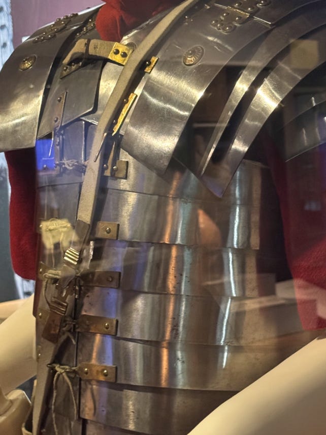 Here is a closeup of the lorica segmentata armor, the distinctive articulated iron armor worn by Roman soldiers from the late 1st to the early 3rd century CE, during the height of Rome’s imperial expansion. Made of overlapping metal strips fastened with leather straps and bronze fittings, it offered excellent protection while remaining flexible and repairable.