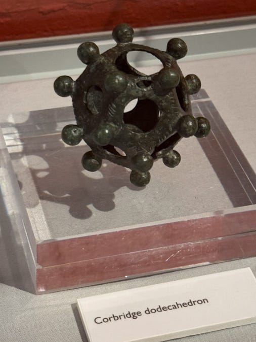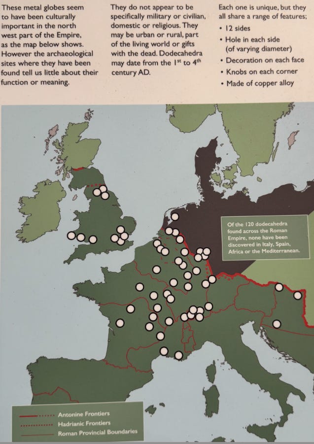 I thought this was really strange and mysterious — the Corbridge Dodecahedron was one of 120 such 12-sided metal globes found throughout northwestern part of the Roman Empire, and no one knows their significance.
