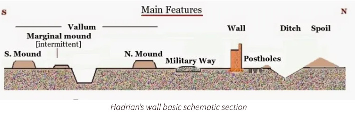 Hadrian’s Wall was designed to be 10 Roman feet (3 m) wide and 15 Roman feet (4.5 m) high. In addition to the wall itself, the Hadrian’s Wall border actually consisted of an entire system of mounds, ditches, and obstacles. A berm of 20 Roman feet (5.9 m) separated the Wall from a forward ditch. The vallum was a flat-bottomed ditch 20 feet wide that ran parallel to the south of the wall and served as a protected military zone.