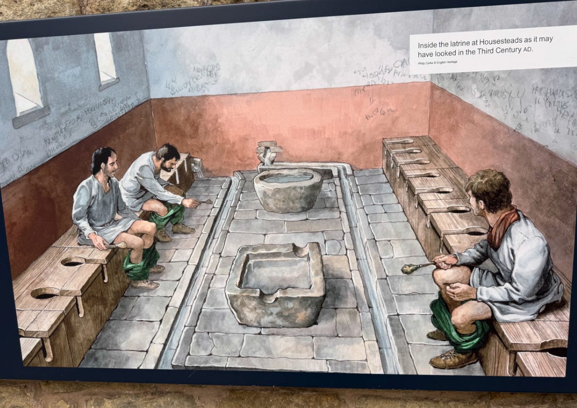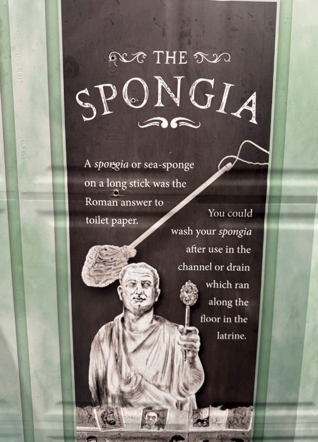 The dreaded spongia — you’d think that a civilization sophisticated enough to build aqueducts and hypocaust floor heating could do better than reusable “toilet paper”!