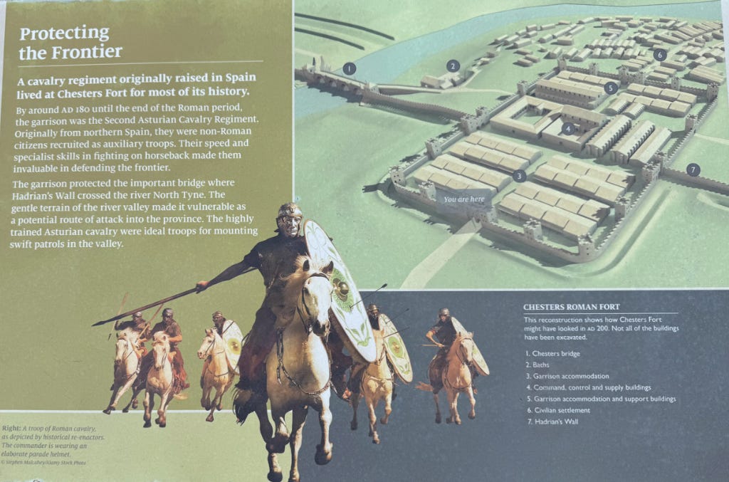 Chesters Roman Wall Fort (Cilurnum), stop 17 on the map above, was founded in the early 2nd century CE, shortly after Hadrian’s visit in 122 CE, to guard the bridge over the North Tyne River, one of the Wall’s most critical crossing points. Garrisoned for much of its history by the Ala II Asturum (aka the Second Asturian Cavalry Regiment), a cavalry unit recruited from northern Spain, Chesters is unique along Hadrian’s Wall for its extensive stables for its mounted legions.