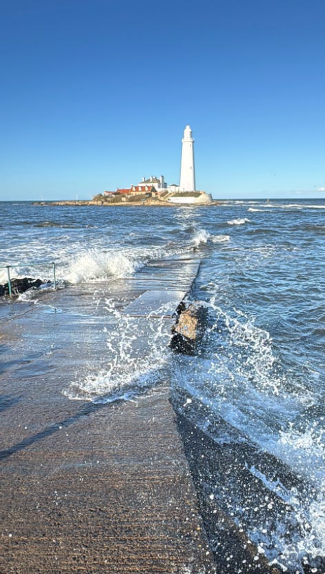 St. Mary’s Lighthouse sits on St. Mary’s Island, which is attached to the mainland only by this causeway which gets fully submerged by the tides periodically.