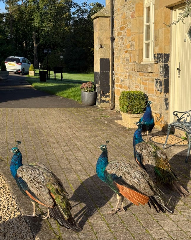 Today, it is boutique hotel on 12 acres of woodland and lawn replete with an imposing stone keep and battlements, beautiful views of the Hadrian’s Wall environs, and a family of wild peacocks!