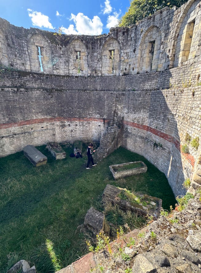 By the 4th century CE, there were massive stone walls which surrounded both the fortress and civilian town, and the Multangular Tower, part of the fortress defenses, survives to this day. Standing before the Multangular Tower, I could still see the distinctive Roman masonry at its base, stones laid by the Legio VI Victrix, which was one of the legions that built Hadrian’s Wall and later garrisoned here.